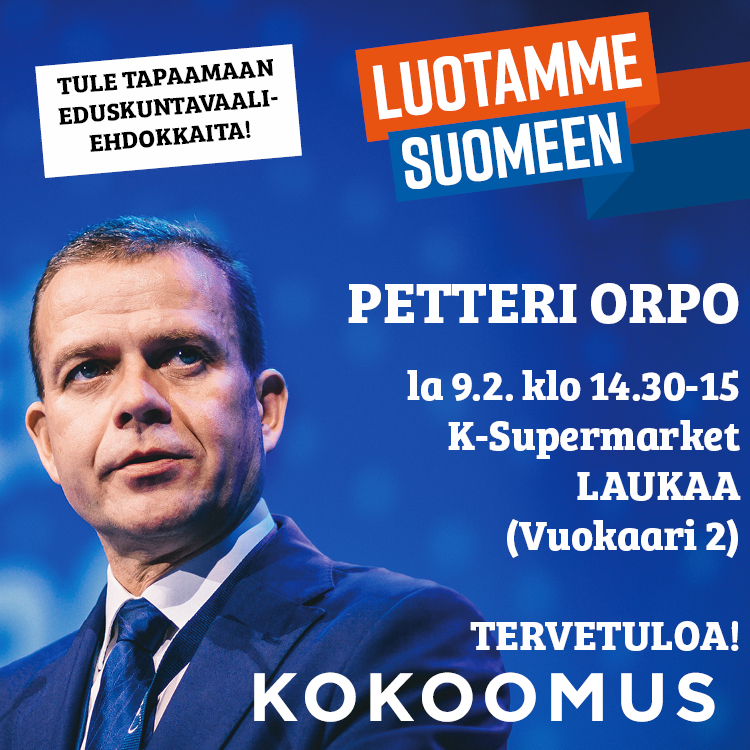 Pe – la 8.-9.2. Kokoomuksen puheenjohtaja Petteri Orpo rantautuu Keski-Suomeen. Puheenjohtajan kierros alkaa Manner-Suomen asukasluvultaan pienimmästä kunnasta, Luhangasta.